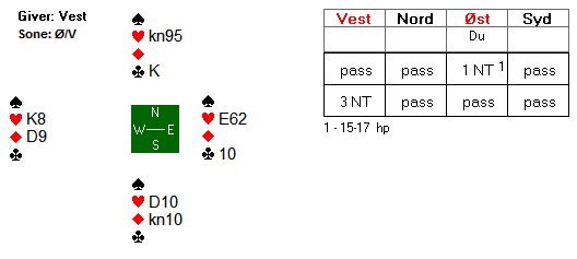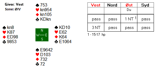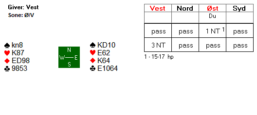 Av to grunner er det farlig å slippe nord inn. For det første risikerer man at han gir makker ei ruterstjeling. For det andre risikerer du å få kløver gjennom bordets ugarderte konge. Dette kan tyde på at spar til esset og spar dame er riktig.
