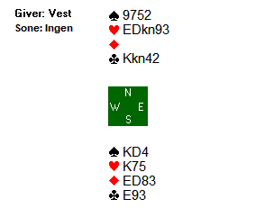 I stikk fem spilte Marius spar knekt fra bordet. Vest la liten, og spillefører slapp en kløver fra hånda. Øst tenkte seg om vel og lenge før han til slutt trumfet med hjerter 7. Han fortsatte så med en liten kløver som gikk via kongen i vest til Marius sitt ess.