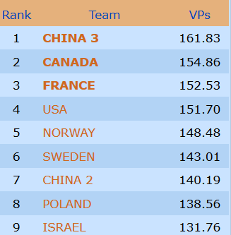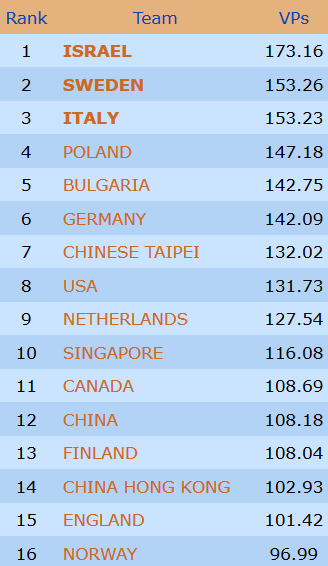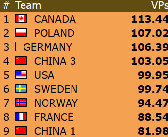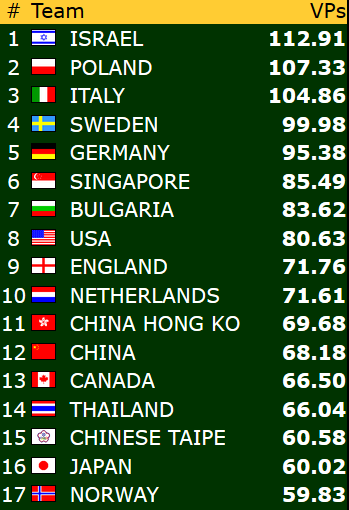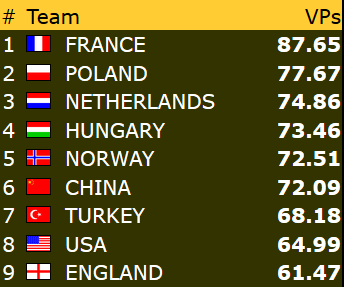 Norges U16-lag hadde på papiret en tøff dag med fire kamper mot motstandere som alle var med i kampen om å sikre plass i sluttspilet. Men kidsa kom godt fra det. Først ble det knepne seire mot Frankrike og USA, før det ble en litt større seier mot Israel og storseier mot Kina 2 i dagens siste kamp. Etter å ha sanket 54 VP i dag er kidsa med det klare for kvartfinale allerede før den siste kampen i grunnspillet mot England. Det er likevel viktig å få med seg et bra resultat fra den kampen for å komme så høys som mulig på den jevne tabellen. Det kan nemlig gi lettere motstand i kvartfinalen.