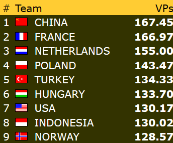 Jentelaget vårt sanket 25 VP i løpet av tre kamper i dag. Etter ni av 15 runder holder laget den viktige åttendeplassen, men har ikke mer enn drøyt to vinnerpoeng ned til Indonesia på plassen bak.