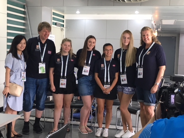 Følg jentelaget på BBO fra klokka 07.30! Her fra en seanse hvor de ble intervjuet på kinesisk TV i dag. Fra høyre Elisabeth G. Sjødal (coach),