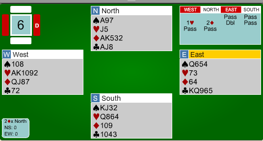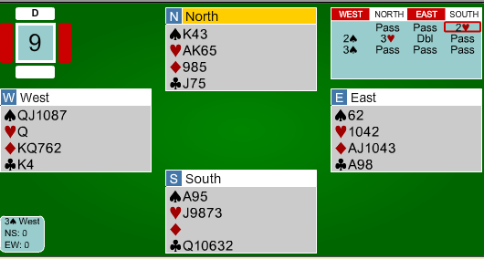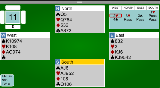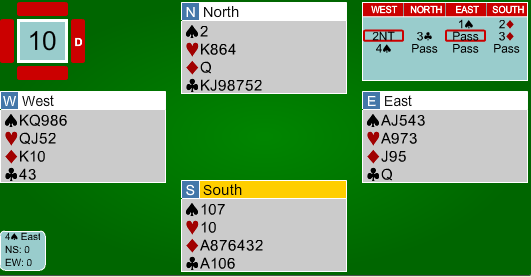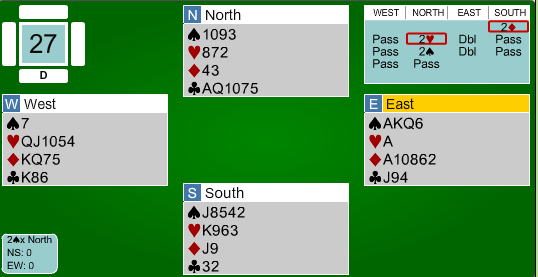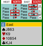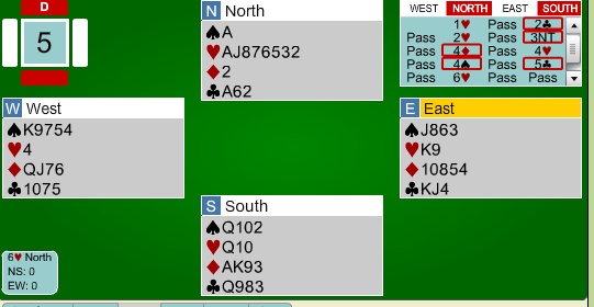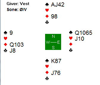 Etter at syd hadde fått et kløverstikk, kom øst inn og skulle trekke ut trumfen i 6 hjerter. I stedet for å starte med en hjerter honnør, mistet øst en liten hjerter i bordet!