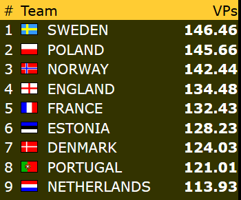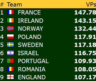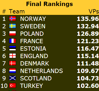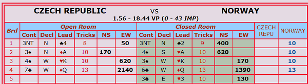 I dagens siste kamp ble det storseier til vårt lag i åpen klasse! Etter IMP-sifrene 87-17 fikk Norge med seg full pott fra kampen mot Tsjekkia. I dag har laget sanket bra med poeng etter følgende rekke resultater: 13 - 16 - 20. Etter syv spilledager ligger Norge dermed på andreplass, drøyt to poeng bak ledende Russland, og med elleve poeng ned til Hellas på niendeplassen.