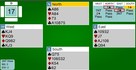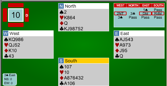Hva de ulike meldingene betydde, har jeg ingen anelse om, og sluttkontrakten tyder på at nord-syd heller ikke hadde det. Trøsten for være at de var utenfor sonen og at slemmen i deres beste tilpasning (både ruter og spar) var helt død slik det satt.