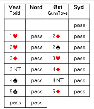 2 ruter i åpning viste minst 4-4 i majorfargene og under åpning. Østs dobling av 2 hjerter var opplysende, og vest passet gladelig ned. Ann Karin flyktet i 2 spar, men det var opplagt for øst å doble. Motspillet startet med to hlye trumf før øst tok for hjerter ess. Deretter tok hun også for spar dame, før ruter ess og ruter til dama fulgte. Nå fikk øst ei hjerterstjeling, før hun kunne fri seg i ruter. Ann Karin stjal i bordet, og spilte kløver til tieren. Øst vant med knekten, og returnerte kløver. Spillefører fikk dermed to kløverstikk, to trumfstikk og ett hjerterstikk. Tre beit ga 500 ut.