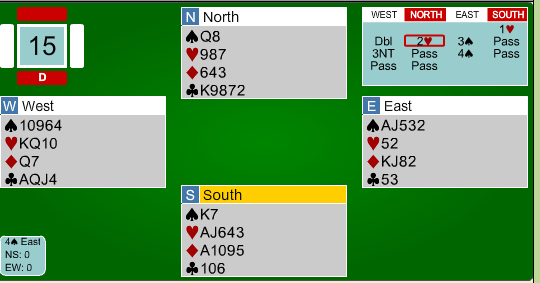 Kontrakten ble 4 hjerter doblet i vest ved begge bord. Kanskje stusser du litt over å høre om sluttkontrakten når du ser kortene, men faktisk var det ikke så unaturlig å havne nettopp der. Etter pass fra syd og pass fra vest, åpnet nord med 1 spar. Hva ville du nå meldt på østs hånd?