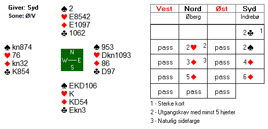 I løpet av dagens fire kamper i Ungdoms-VM dukket det selvsagt opp en del interessante giver. Blant disse var et spill der ikke altfor mange fant den svært så sjanserike ruterslemmen. Ida Marie Øberg og Thea Lucia Indrebø meldte seg fram til 6 ruter på følgende vis: