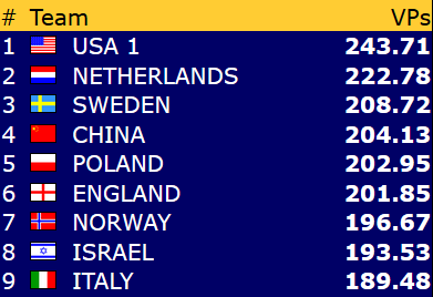 Foreløpig tyder det på at mitt budsjetterte poengkrav på 11,2 VP for å være innenfor topp 8 har vært for snilt. Hva vil kreves for å gå videre til slutt? Det viktigste er uansett at Norge går videre! Avstanden ned til niendeplassen er i øyeblikket på drøyt 8 VP.
