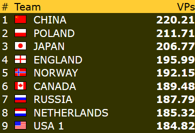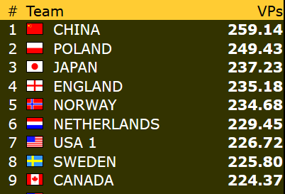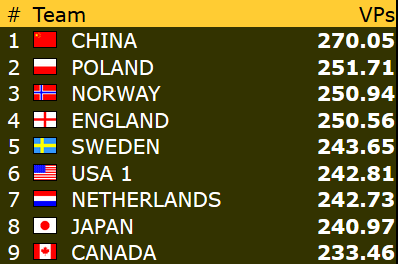 Norge ligger på fjerdeplass med nesten 13 VP ned til niendeplassen.