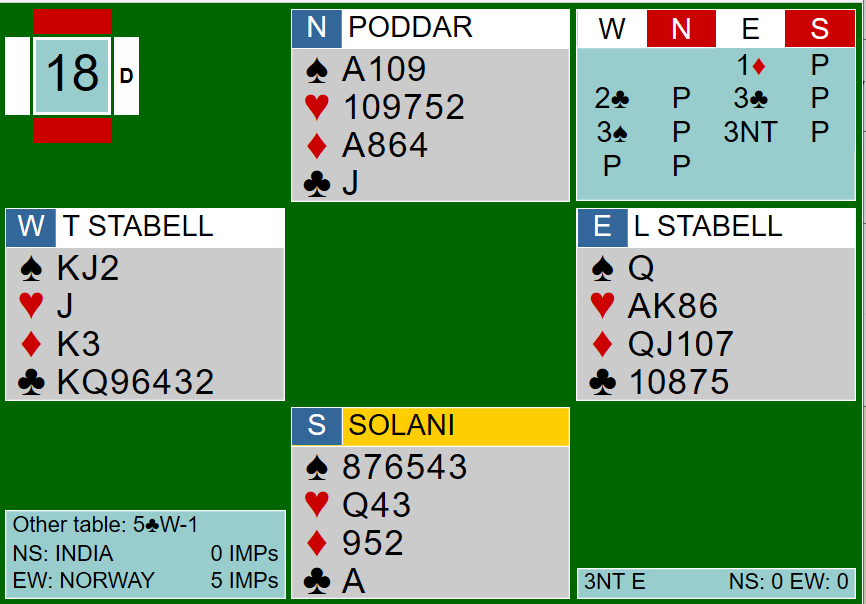 Merk at Leif-Erik i øst støttet stille og rolig til 3 kløver. Over 3 spar fra Tolle, som var holdvisende, var det naturlig å melde 3 grand på Leif-Eriks hånd. Han har dobbel stopper i hjerter, og dessuten kan spar dame bidra som en mulig ekstra stopper i spar, særlig når man får kontrakten på si hånd. I 3 grand ble det ti stikk. Det var verdt 13 IMP da India gikk beit ved det andre bordet.