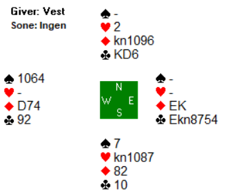Jeg har forståelse for at nord vil være med og ikke har noen opplagt melding, men jeg har uansett ikke sansen for 1 grand. Kanskje er det et alternativ å redoble eller i verste fall støtte sparen på dobbelton? Riktignok er det ugunstig sone, men det har vel makker også tatt i betraktning. 1 spar bør ikke være noen tullemelding i disse soneforholdene. Dermed vil jeg hevde at det meste tyder på at nord-syd har minst like mange poeng som øst-vest, og å så fall er det trolig at det er de som har høyeste kontrakt.