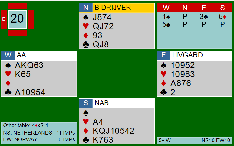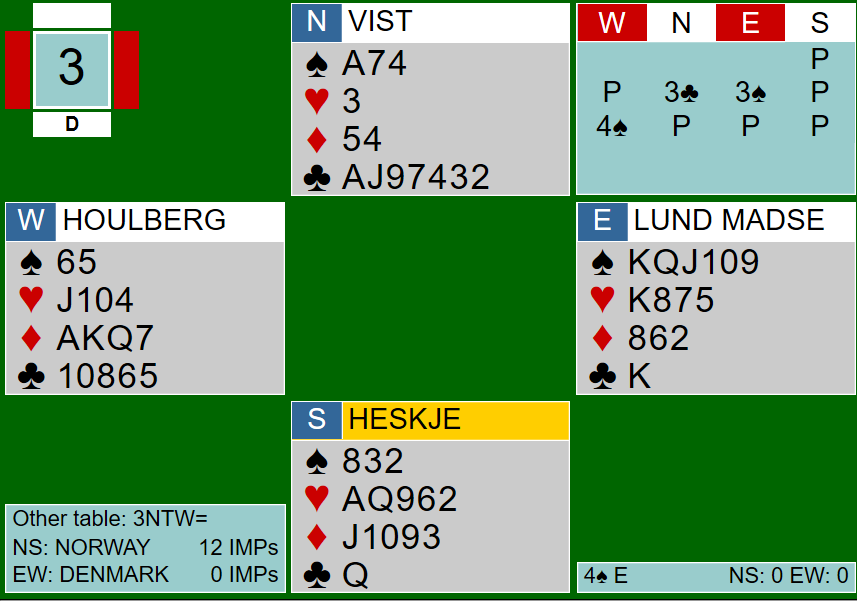 Ved det andre bordet spilte nederlenderne med sterk kløver. Etter innledninga 1 kløver - 1 ruter gikk Boye inn med 4 ruter i syd: