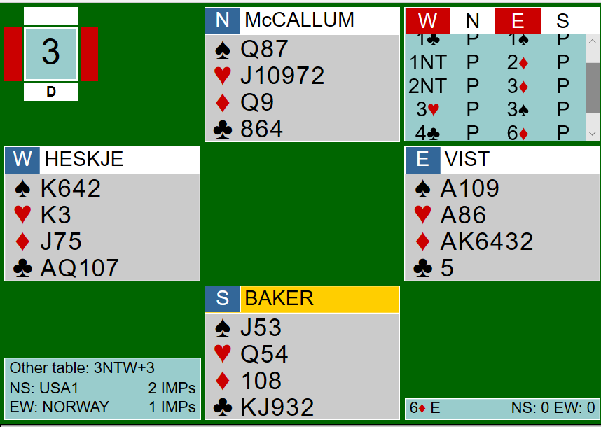 Også i åpen klasse ble det slemsving til Norge da Boye og Espen meldte 6 ruter på følgende vis, mens USA stoppet i 3 grand ved det andre bordet: