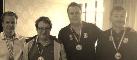 Veteranlaget støttes av NBF med startkontingent og landslagsskjorter, men dekker alle andre kostnader selv. Parene er Helge og Roald Mæsel, Arve Farstad - Tor Bakke og Peter Marstrander - Rune Anderssen. Alle seks er velkjente spillere som har vunnet et utall av norske mesterskap, så rutinen skal det ikke stå på. (Men rutine er vel vanlig i et mesterskap for seniorer?!?) De har ikke med seg noe offisielt støtteapparat, men undertegnede vil hjelpe de litt med det praktiske.