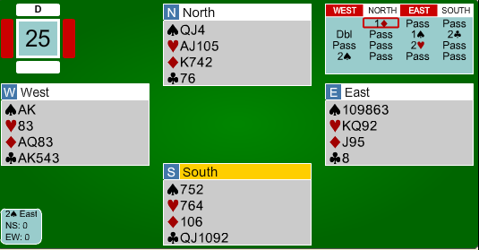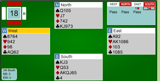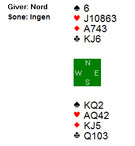 Syd tok en sjanse på 3NT over 2NT, som kunne være en svak hånd med minor. Øst spilte ut hjerter dame, og kontrakten står med ruter ess foran og ruteren 2-1.