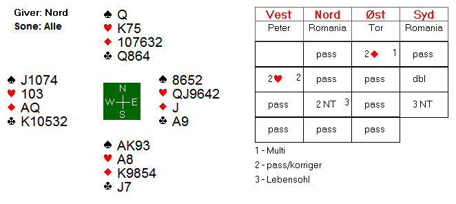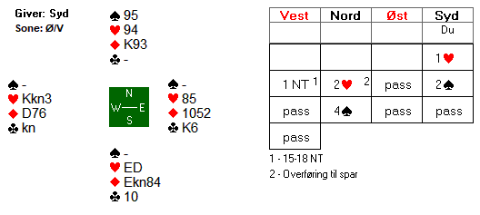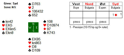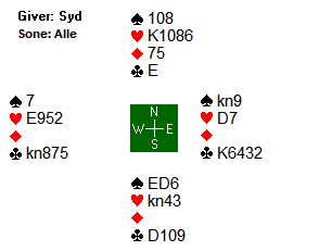 Syd vant kløveren med kongen og spilte ruter til kongen som stod. Så fulgte spar 9, som fikk seile til vests dame. Peter kunne nå godspille kløveren med kløver knekt, med ruter ess som innkomst, og spillefører fikk ikke mer enn 3 kløverstikk, hjerter ess og et ruterstikk for 300 i beit.