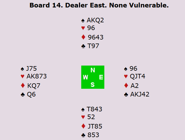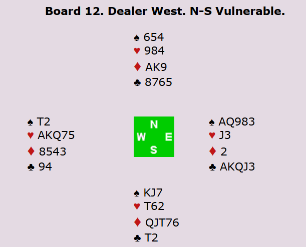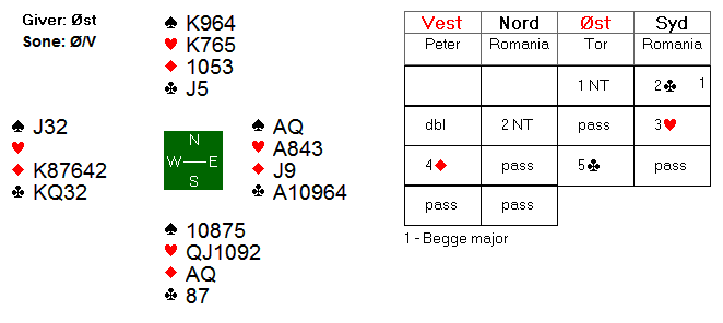 Ved det andre bordet meldte syd inn, og da kom Norge i 5 kløver i stedet, som er en mye bedre kontrakt. Når ruteren sitter så fint som nå, står det til og med 12 stikk. Selv uten innmelding har det norske paret system for å unngå 3nt, der vest kan melde 2sp etterfulgt av 3hj for å vise 3 korts spar og minst 5-4 i minor. Da vil de også komme i 5 kløver.