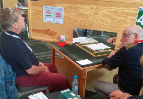For veteranene spilte Peter hjem 4 spar på syds hånd. For å vinne den litt hardmeldte utgangen må man gjøre riktig i ruter og finne hjerter knekt. Ved det andre bordet fikk øst-vest spille 3 kløver med to beit, og dermed ble det 8 IMP til Norge. I åpen klasse stoppet Boye og Espen i 3 spar med ti stikk, men det ble likevel stor gevinst til Norge da Allan og Terje fikk spille 2 ruter doblet med overstikk øst-vest! Dobbeltscore er alltid fint.