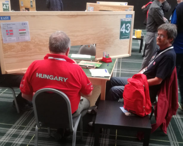 Dette var for øvrig et interessant spill der det altså var om å gjøre å unngå 3 grand. For det norske damelaget meldte Gunn Tove Vist og Torild Heskje den flotte kontrakten 5 kløver, mens ungarerne ved det andre bordet meldte 3 grand med beit. Dermed tjente de norske damene 12 IMP på dette spillet. De leder sin kamp 31-19 før de fire siste spillene.