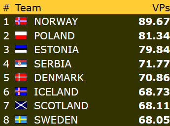 Åpen klasse: Norge er på syvendeplass med ni poeng opp til medalje og ett poeng ned til niendeplass (førsteplassering som ikke gir VM-plass)