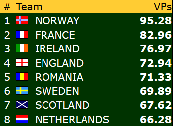 Veteranklassen: Norge leder, og har halvannet poeng ned til Frankrike på andreplass, mens det er 23 poeng ned til niendeplassen (førsteplassering som ikke gir VM-plass)