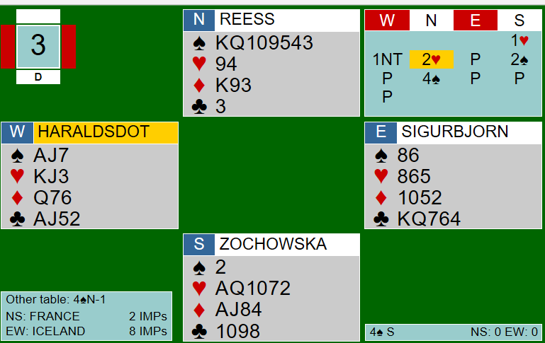 Den gunstige sitsen gjorde at det ble tolv stikk i hjerterkontrakt også, men det ble uansett 12 IMP til Island.