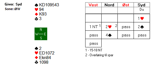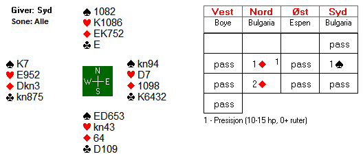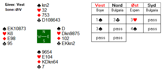 Han nøyde seg med 4 spar over 3 spar fra Boye, og dermed endte de i en sunn kontrakt. Utspillet var en liten hjerter, som gikk via knekten i syd til spilleførers ess. Han fortsatte med å seile spar dame rundt til syds konge. Det var ikke heldig med den aktuelle sitsen, men veldig naturlig i og med at sparlengden etter alt å dømme er i nord og spillefører har svært begrenset med inntak på hånda. Det var uansett ingen fare så lenge kløveren oppførte seg. Alt nord fikk var to trumfstikk, og dermed ble det ti stikk på spillefører.