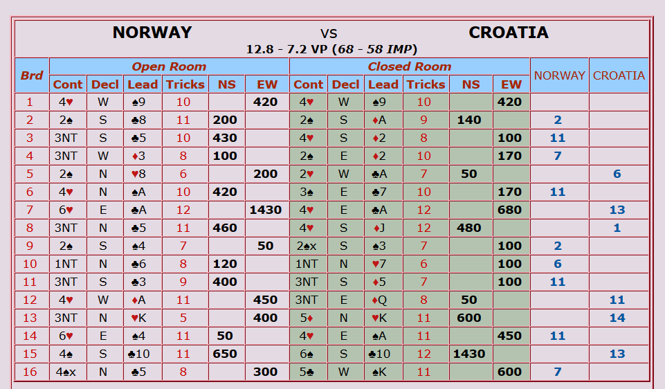 Dermed 7 IMP inn til Norge på det siste spillet, og 68-58-seier til Norge. Det gir 12,8 VP til Norge etter det som må være den kampen Norge har spilt i løpet av mesterskapet med klart mest omsetning!