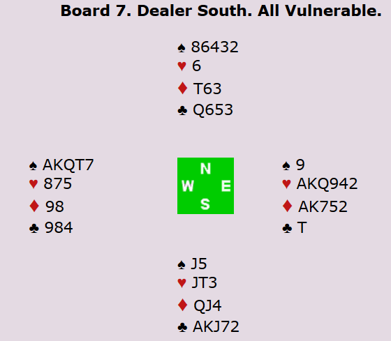 3 ruter fra Terje i syd viser konstruktive kort i disse soneforholdene. Allan hadde uansett ikke gode nok kort til å gjøre noe mer, og dermed ble det sluttkontrakten. Der var det ni enkle stikk, mens Espen og Boye hadde fire hjerterstikk og to ess mot 3 grand. 7 IMP til Norge.