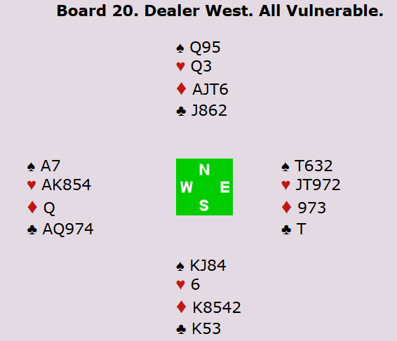 Denne gang ble det ikke riktig. Selv om det ble ei beit i kontrakten, fikk Bulgaria 8 IMP etter å ha meldt og vunnet 4 hjerter ved det andre bordet. I den kontrakten var det ikke mer enn to sparstikk og et trumfstikk å få tak i for forsvaret.