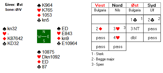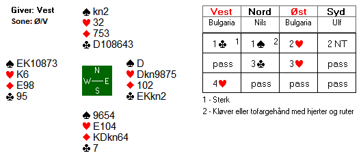 Her fant kroatene den gode hjerterslemmen øst-vest, mens Ulf og Nils stoppet i utgang for Norge. Man kan se for seg at det ikke er så enkelt å melde etter at syd åpner og vest går inn med 1 spar. Det er vanlig å spille 2 hjerter som konstruktivt (men ikke krav) fra øst i denne posisjonen. I så fall må øst overmelde motpartens farge (som i første omgang tyder på god løft i spar). Vest melder 2 spar, før øst kommer igjen med 3 hjerter, som er krav. Vest har ikke så mye annet å melde enn 4 hjerter. Men dette er ei melding som må avgis på en del ulike hender. Han trenger hverken ha 3-korts hjerterstøtte eller stjeleverdi i ruter. Så det er ikke unaturlig at øst passer ned. 13 IMP ble det til Kroatia i alle fall.