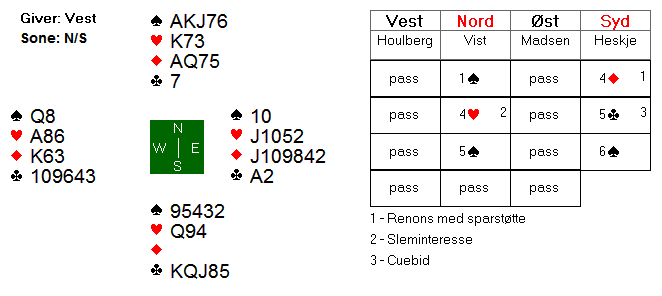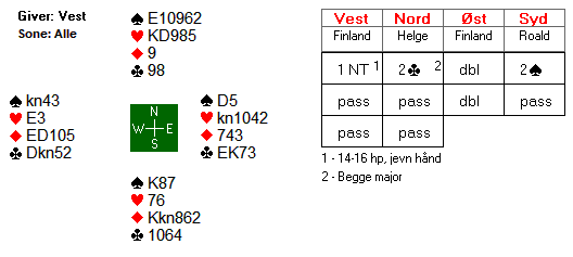 Espen valgte å åpne i 2 kløver på hånden i nord, og da ble det vanskelig for motparten å komme inn. Øst meldte inn 2 ruter, men etter systemet viste dette 4+ spar + en minor. Øst hadde glemt dette, og vest fant aldri ut hvilken minor makkeren hadde, og Espen fikk spille 4 spar for 10 stikk og +620.