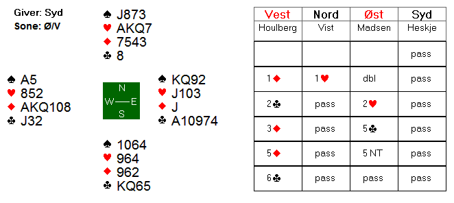 6 hjerter ble meldt og vunnet ved ti av de 76 bordene som er i aksjon i de tre klassene. I tillegg var det fem spilleførere som gikk beit i 6 hjerter.
