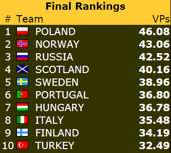 De norske damene vinner til slutt 58-20, og kan overnatte på 2. plass etter første dag, 0,60 VP bak Polen!