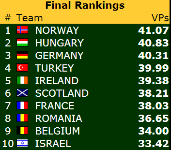 Totalt sett har det vært en dag under pari med 9,09 poeng mot Russland, 12,55 mot Wales og 1,56 mot Monaco. Likevel henger Norge godt med i kampen om både medaljer og VM-plass. Det er veldig tett på resultatlista! Norge er på femteplass, og har ikke mer enn knapt syv poeng opp til ledende Italia. Opp til Island på bronseplass er det 3,5 poeng, mens det er rundt elleve poeng ned til Polen på 9.plass (første plassering som ikke gir VM-billett).