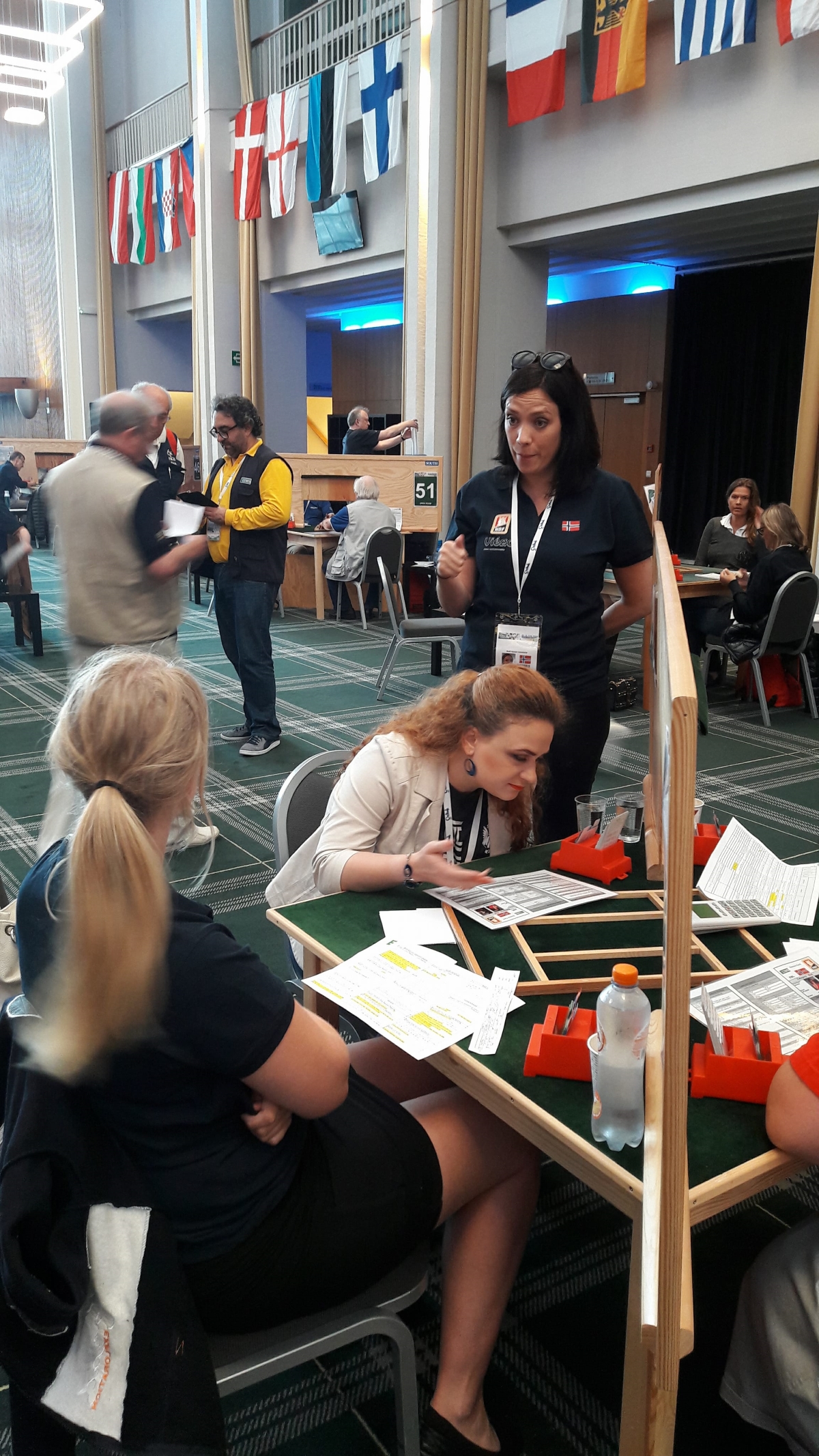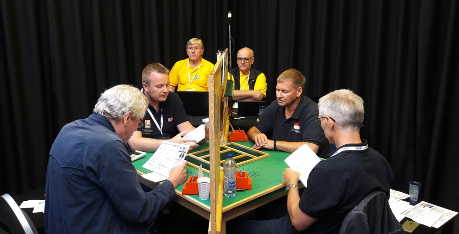 I skrivende stund er dagens siste kamp godt i gang. To av Norges lag overføres på BBO. I åpen klasse møter Norge Monaco (med Geir Helgemo og Tor Helness). I dameklassen møtes Norge og Danmark. I veteranklassen møtes også Norge og Danmark, men denne kampen overføres ikke på BBO. Under kan du se noen bilder fra de norske BBO-oppgjørene.