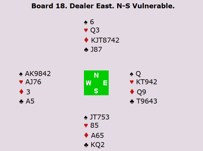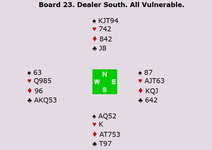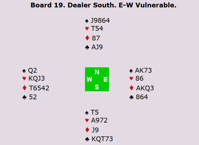 Som vi ser er det tre topptapere i ruterkontrakt, men det fordrer at forsvaret får innkassert de to kløverstikkene før spillefører kommer inn. Hvis ikke kan spillefører ta ut trumfen og kaste en kløvertaper på det redje sparstikket. Mot 3 grand har nord-syd fem kløverstikk og hjerter ess. 8 nye IMP til Norge og 19-0 etter to spill.