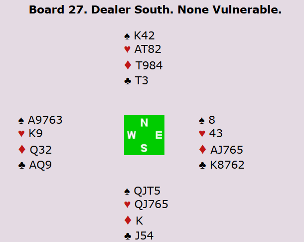 På spill 27 fikk Allan og Terje spille 4 hjerter med 10 stikk, mens Espen og Boye meldte over i 4 spar. Øst burde ha doblet og redusert til 3 IMP til Norge, men nå ble det i stedet kun 100 og 8 norske IMP.