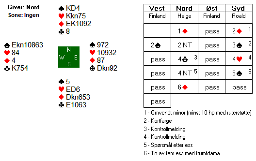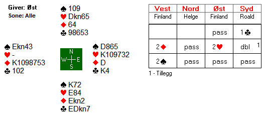 Mot 2 spar spilte Helge ut en kløver gjennom bordets konge. Dermed startet forsvaret med to kløverstikk. Roald skiftet så til en liten trumf, som gikk til bordets dame. Da spillefører så spilte ruter dame, lasjerte Roald. Om han hadde stukket, ville spilleførers vei til hjemgang blitt enkel, fordi han kan sette opp ruteren. Nå ble det imidlertid for få inntan på hånda til både å få satt og ruteren og få hentet stikkene. Det hele endte med ei beit.