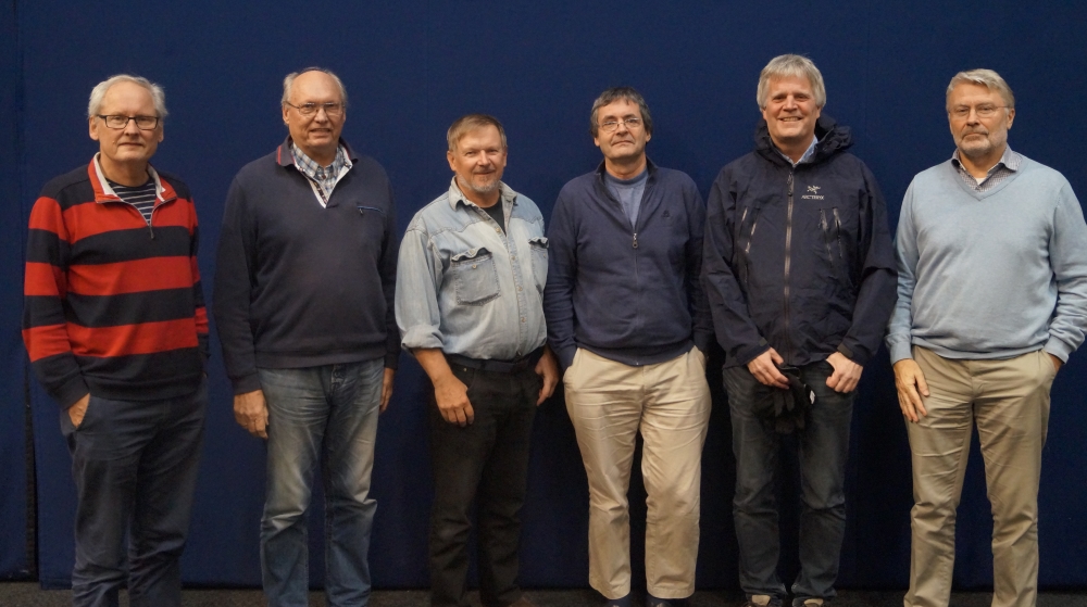 Veteranlaget kunne nyte en bedre middag etter en god start. f.v. Helge Mæsel, Christian Bakke, Kari Bakke, Bjørg Mæsel, Leif-Erik Stabell, Peter Marstrander, Tor Bakke, Tolle Stabell, Roald Mæsel. Siri Sandnes var fotograf.