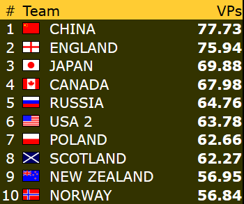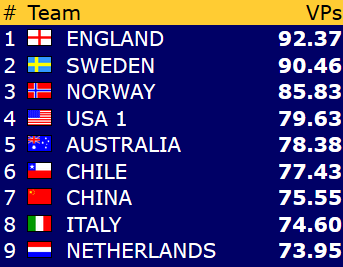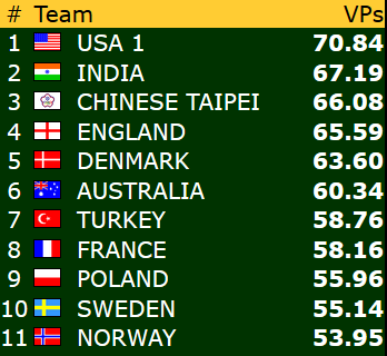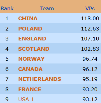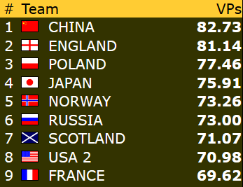 | 9 | USA 2 | 9-16 | 11,2 | 10,61 | -0,59 |