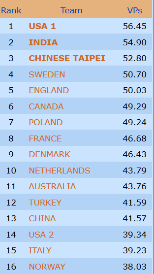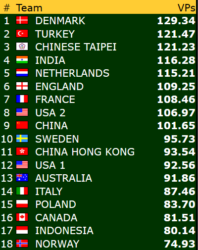 Norge - Indonesia 6,96 - 13,04 (IMP-score: 33 - 44)