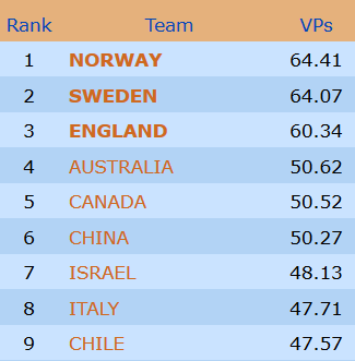 | 9 | Australia | 9-16 | 13,5 | 16,73 | +3,23 |