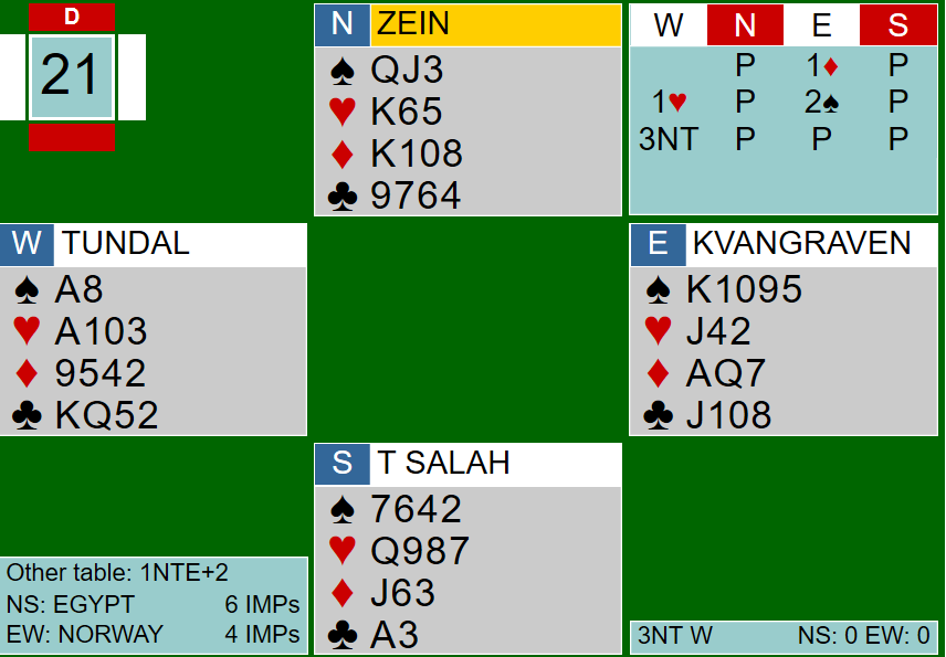 Nord var imidlertid fristet til å få ei stjeling i hjerter, og spilte dermed hjerter til makkers dame. Problemet var bare at makker ikke hadde flere hjerter å spille. Syd fridde seg med en trumf, og da den satt 3-2 var utgangen hjemme. Motparten kunne ikke få mer enn ett trumfstikk til. Nils presset bare høye hjerter. På håndas femte hjerter forsvant rutertaperen i bordet. Syd kunne trumfe når han ville, men bordets siste trumf kunne brukes til å trumfe ruter dame. Dermed ti stikk og ti IMP til Norge da Egypt stoppet i delkontrakt ved det andre bordet.