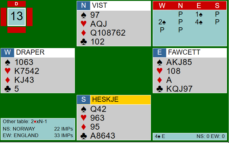 200 mot 620 ga 9 IMP til England. Om de norske parene hadde fått til optimale motspill ved begge bord, ville det blitt 12 IMP til Norge i stedet (500+100 inn), og kampen ville nesten vært buttet.