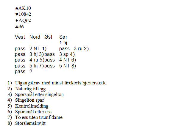 Ingen andre kopierte denne kontrakten hverken i dameklassen eller i åpen klasse. De aller fleste spilte lilleslem i hjerter, mens en håndfull ulykksalige prøvde seg i 7 hjerter, og enda noen flere stoppet i utgang.»