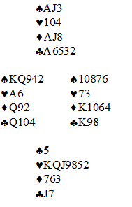 Vest spilte ut en trumf til bordets dame, og tre runder spar brakte Øst inn. Han skiftet til ruter konge som han fikk for, kløver skiftet gikk til bordets konge og hjerter derfra avslørte sitsen. Opp med esset, kløver ess, og da var sluttposisjonen: