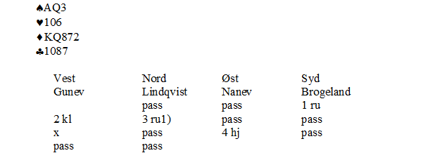 Du skal få et motspillsproblem som forekom i Tønsberg Bridgeklubb nylig. Du sitter Syd med Ø-V i sonen, og meldingene går:
