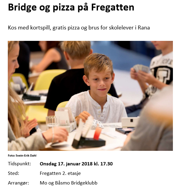 Nær 300 elever i Rana kommune får denne uken sitt første møte med bridge. Mo BK og Båsmo BK samarbeider, og satser skikkelig på å få rekruttert mange nok unge spillere denne uken til å starte en egen juniorbridgeklubb.