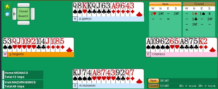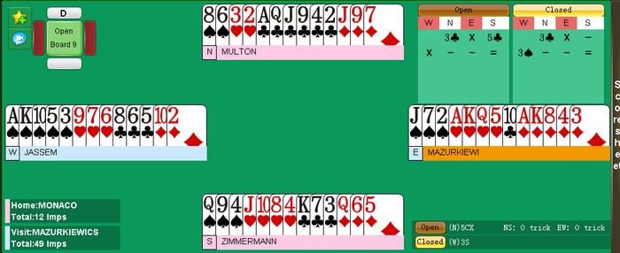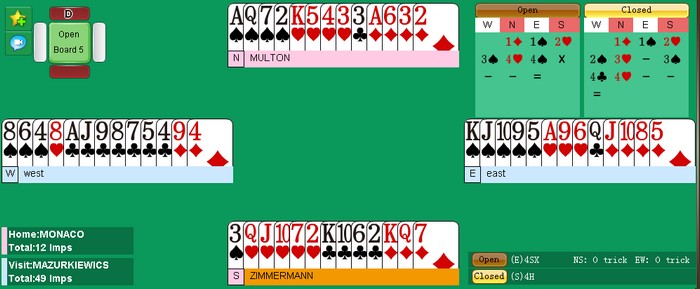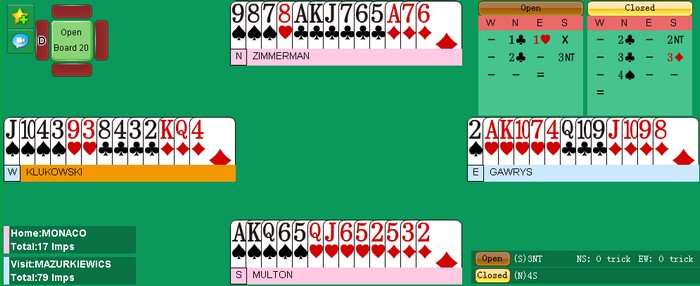 når Zimmermann startet med singel spar tre mot stampen. Av en eller annen grunn valgte å Multon å ikke stikke den og da fikk spillefører fire sparstikk hjemme, to hjerterstjelinger og to ess for åtte stikk. Det ble -300 mot 620 på det andre bordet der polakkene vant 4hj.